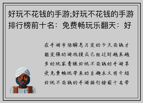 好玩不花钱的手游;好玩不花钱的手游排行榜前十名:免费畅玩乐翻天:好游不花钱,轻松享乐
