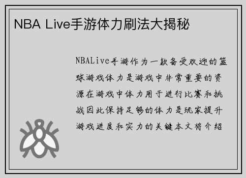 NBA Live手游作为一款备受欢迎的篮球游戏,体力是游戏中非常重要的资源。在游戏中,体力用于进行比赛和挑战,因此保持足够的体力是玩家提升游戏进度和实力的关键。本文将介绍一些刷体力的方法,帮助玩家更好地利用资源,提高游戏体验。 1. 日常任务 日常任务是获得体力的重要途径之一。每日完成一系列任务,如参加比赛、完成挑战等,都可以获得丰厚的奖励,其中包括体力。玩家可以根据自己的时间安排,合理规划每日任...