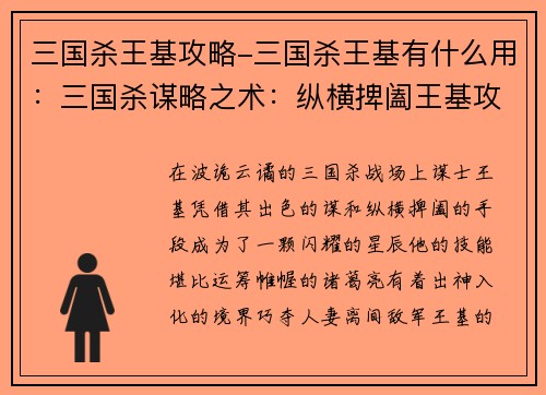 三国杀王基攻略-三国杀王基有什么用:三国杀谋略之术:纵横捭阖王基攻略