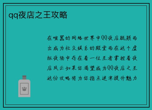 在喧嚣的网络世界中,QQ夜店脱颖而出,成为社交娱乐的殿堂。而在这个虚拟夜场中,存在着一位王者,掌控着夜店风云。如果你渴望成为QQ夜店之王,这份攻略将为你指点迷津。