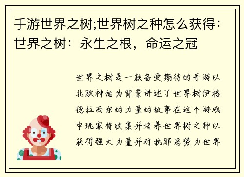 手游世界之树;世界树之种怎么获得:世界之树:永生之根,命运之冠